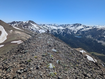Looking up at East Peak. View of the entire ridge from Aneroid Summit, looking north. Hidden peak is in front of East Peak.